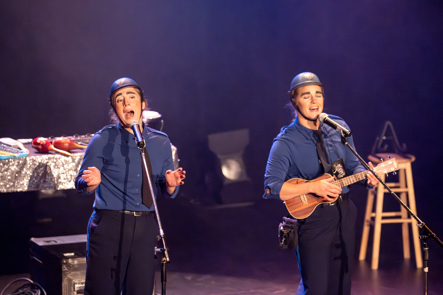 As the audience enters the theatre, the p’tites polisses move through the space to ensure security. The concert of Rizotto, a singer-prisoner held under high police surveillance, is about to begin. The lights come up on stage and plot twist, Rizotto refuses to leave his dressing room! Between musical improvisations and acrobatic mishaps, the p’tites polisses try to convince Rizotto to come on stage, but succeed only in losing control themselves.